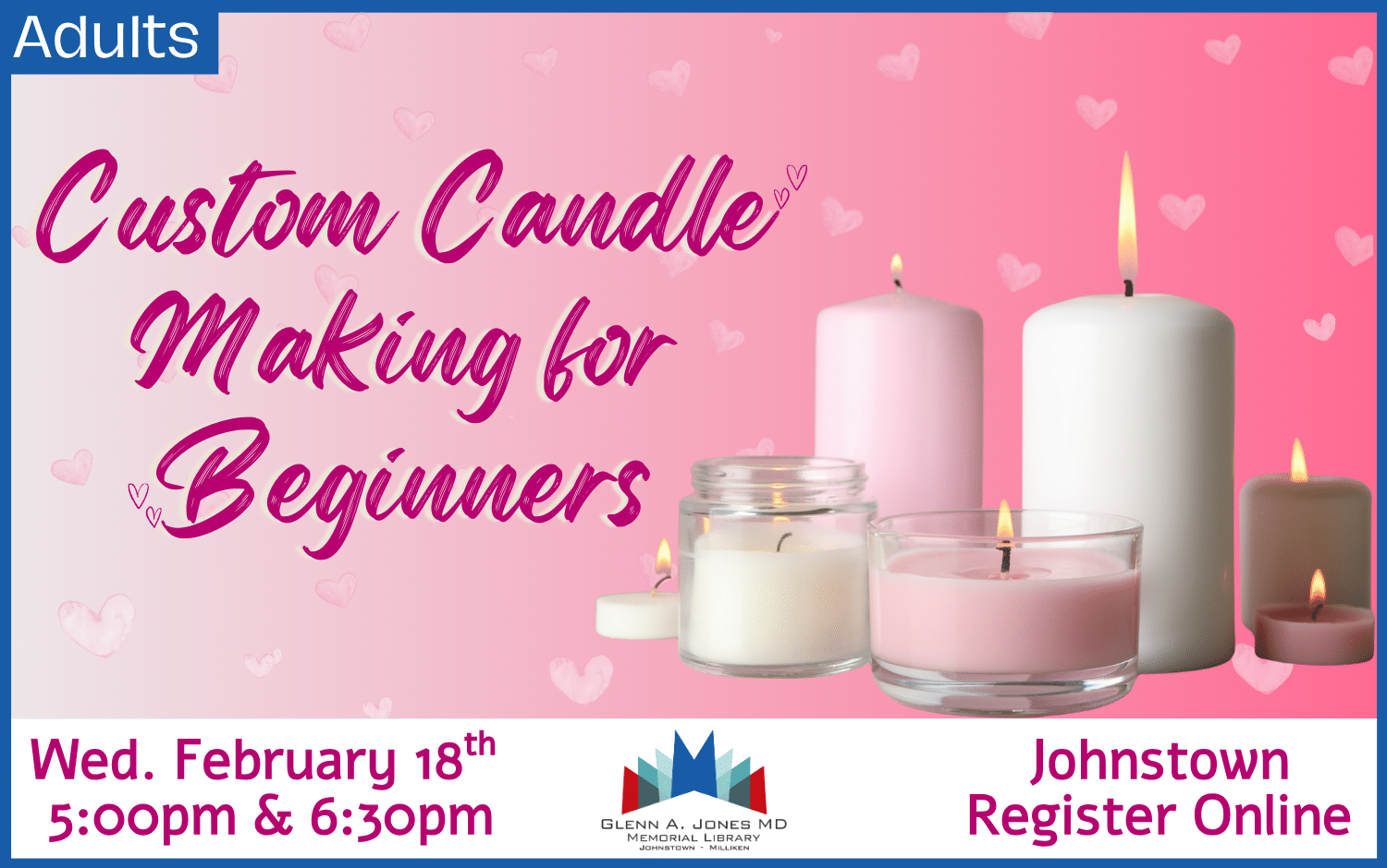 Come hang out in the Makerspace and make a Valentine’s candle that’s cute, cozy, and totally swoon-worthy. Warning: you may fall in love with candle making. Participation is limited to every three months.